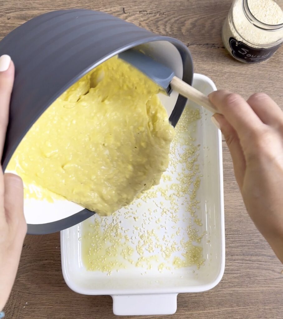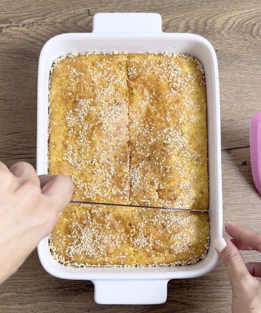- Λαδώνεις ένα ταψάκι και πασπαλίζεις με σουσάμι ή τριμμένη φρυγανιά.