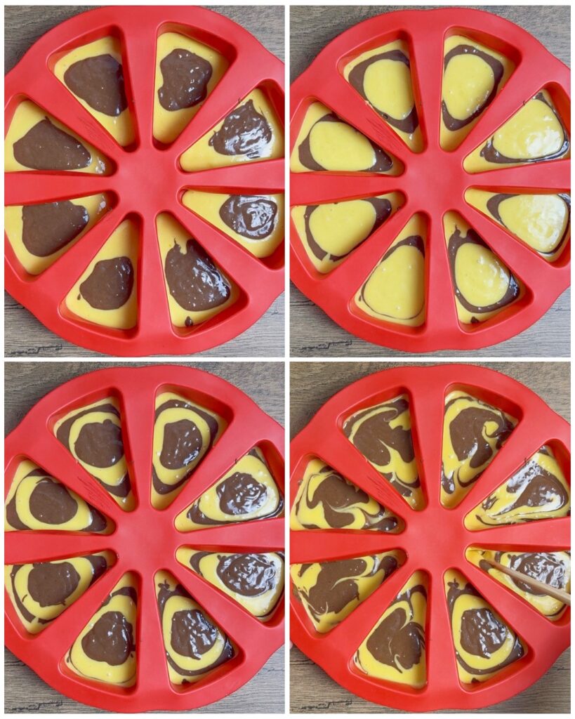 4. Στη φόρμα, βάλε πρώτα ένα στρώμα μείγμα βανίλιας, μετά μια κουταλιά μείγμα κακάο. Επανάλαβε άλλη μία φορά.