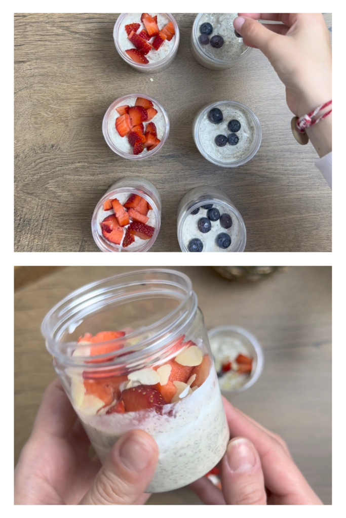 2.Μοιράζεις το μείγμα σε βαζάκια. Προσθέτεις 1 κ.σ γιαούρτι σε κάθε βαζάκι και φρούτα.